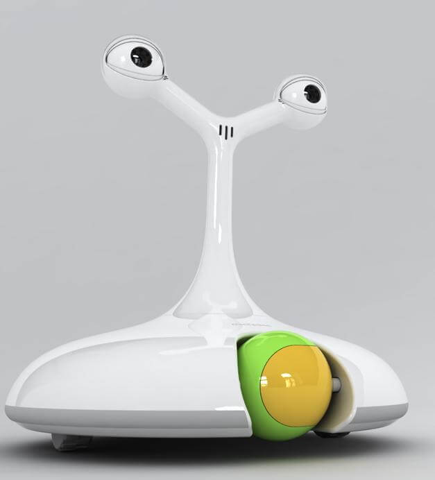 Unlike Rovio, the Robot Pet Sitter concept includes two eyestalks with cameras and microphones to provide stereo vision and hearing. While that functionality would be wasted if you were accessing the robot via a traditional desktop computer, a head mounted display could give you a 3D view of the robot's surroundings, immersing you further into playtime with Rover. A speaker in the center of the bot lets you talk to your lonely pet while recessed wheels let you chase it as it runs away from the scary looking machine. Have a more aggressive housemate? The eyestalks automatically cover the cameras with plastic lids in the case of chewing or collisions.