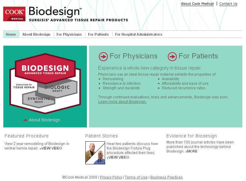 If you believe in your product you try to sell it to as many people as you can. If you are fanatical about your product you design a website to evangelize others to its use. Cook Medical produces a tissue regeneration matrix called Biodesign that we've praised before. Yesterday, the company launched CookBiodesign.com, a website devoted to explaining the benefits and successes of the matrix. Involved in more than a million procedures worldwide, Biodesign is a well tested alternative to synthetic meshes and biological grafts. Not bad for a product derived from pig intestines.