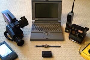 Next up is a Polaroid instant camera and what…a carphone? Dominating the middle area there is an early Mac laptop, a digital watch, and a pager. Moving counterclockwise we’ve got a JVC camcorder, and that beautiful piece of clunk on the far left is an early Apple PDA, deliciously named the Apple Newton.