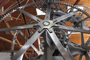The steel power storage wheels wind a 75-foot geared steel spine, 20 feet of which is already built. Smaller elements (gears and rollers) are titanium with ceramic bearings. Although the system isn’t lubricated, it efficiently converts over 90% of the supplied outside energy into clock energy.