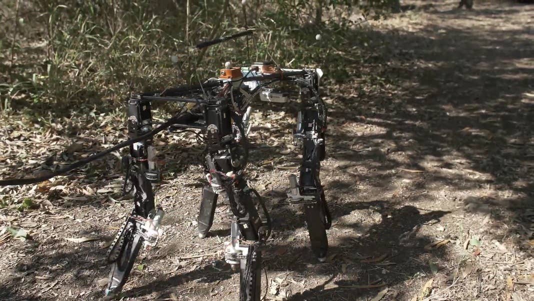 When DyRET is walking, it continuously senses the environment through its feet and 3D camera. When the robot detects a change in ground conditions, it can change to the best leg length. But how does the robot know what body shape works best?