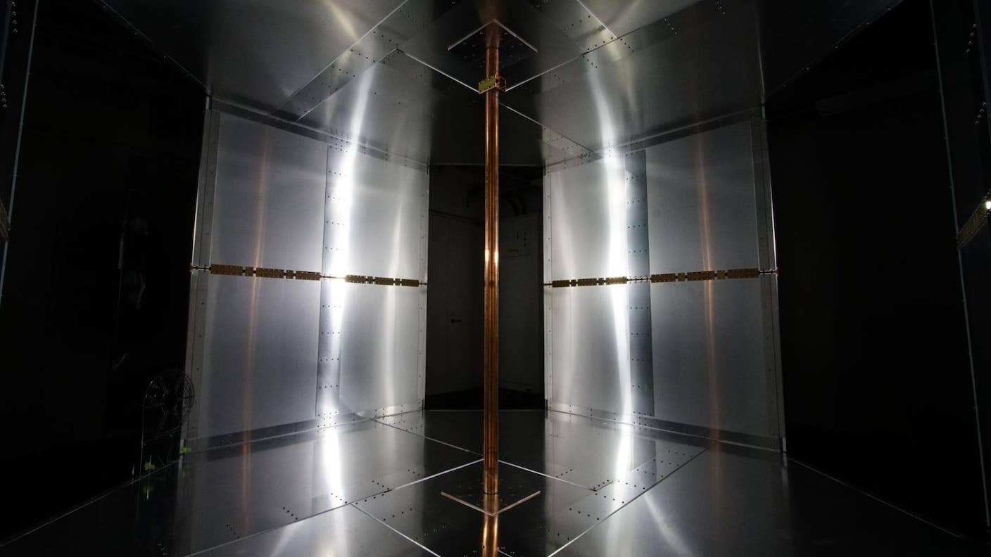 To build the system, Sample and colleagues from the University of Tokyo installed conductive aluminum panels in the room’s walls, floor, and ceiling and inserted a large copper pole in the middle of it. They then mounted devices, called lumped capacitors, in rows running horizontally through the middle of each panel and at the center of the pole.
