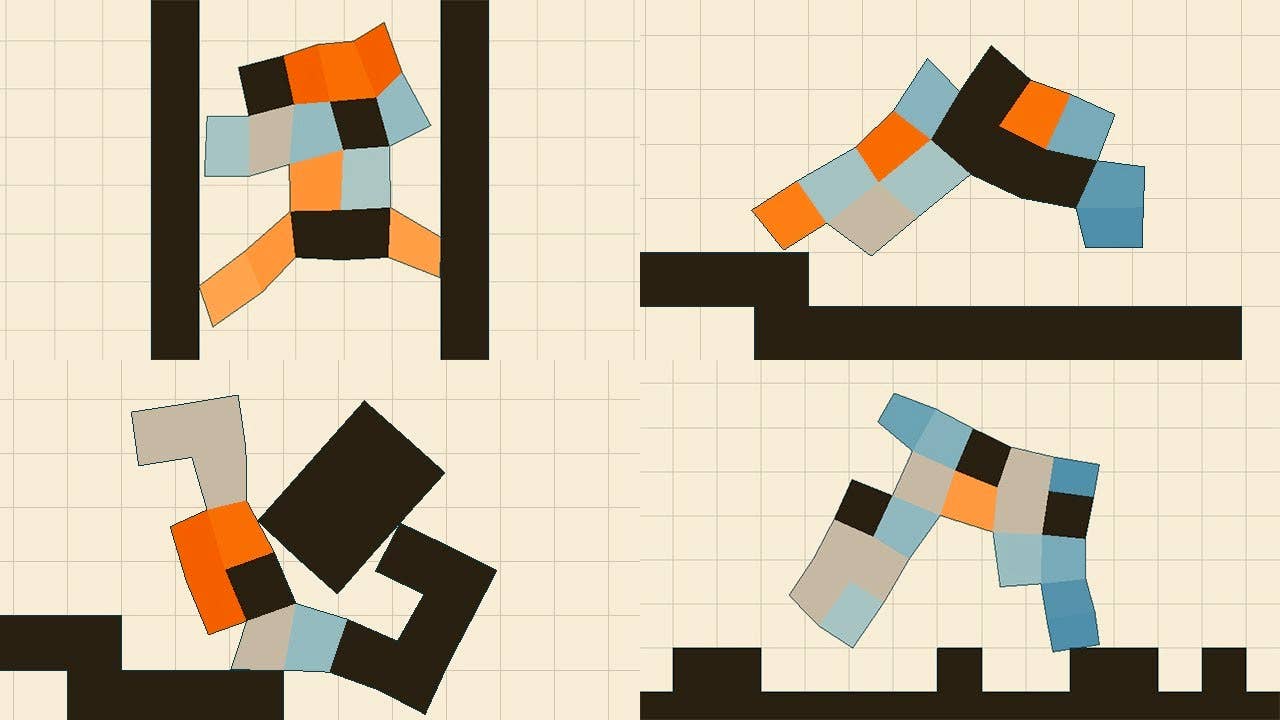 The environment allows design algorithms to build robots by linking together squares that can be soft, rigid, or actuators—essentially muscles that enable the rest of the robot to move. An AI system then learns how to pilot this body and gives the design algorithm feedback on how good it was at different tasks.